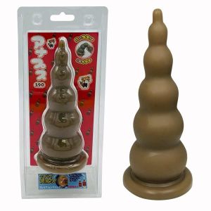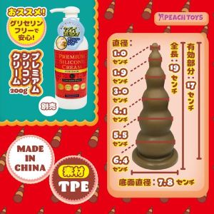 あのね、こんなディルドがあるの!『穴にプスッとこのカタチ』っていうんだよ!6つに段があるから、どこまで入れるか楽しんでね。最後には6.4cmまで入るよ!穴にフィットして、優しく感じるんだって。長さは190mmで、上級者用だから気をつけてね。グリセリンフリーの潤滑剤がおすすめだよ!材質はTPEで、中国で作られたんだって。