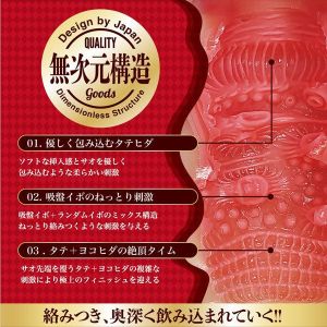 この商品のいいところは、入口部分が優しく包み込んでくれるから最初から気持ちよく始まれるところ。そして、吸引イボのねっとり刺激がある中間部分から、タテヨコヒダの最深部までパンパンに気持ちいいんだって。
