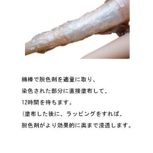 使い方は簡単!まず、ドールの汚れや色が付いたところを洗ってから、脱色剤を綿棒にとって色が付いたところに塗るんだよ!12時間待って、それでOK!でも、濃い色の場合は何度か塗らないと落ちないかもしれないから要注意!