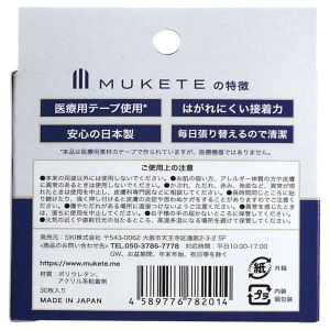 みなさんこんにちは!今日は、「MUKETE 3個+MUKETE WIDE3個セット」の特徴についてお伝えします!まずね、この商品は、3個のレギュラーサイズと3個のワイドサイズが入っているんだよ。使いたいサイズに合わせて、自分にピッタリの使い方ができるよ。しかも、この商品は日本製で、医療用テープを使っているので、安心して使えるんだよ。(※医療機器ではないのでご注意を)さらにさ、手軽でお値段もお手ごろだから、初めて使う方にもオススメだよ!使い終わったら捨てるだけだから、清潔で使いやすいのもポイント高いんだ。そして、透明テープを使っているから、自然な印象に仕上がるんだよ。気になる方はぜひ、試してみてね!注意点もしっかりとお伝えしなくちゃね。この商品は、本来の用途以外には使わないでね。お肌が敏感な方や、アレルギー体質の方、皮膚に異常があるときは使わないでね。長時間使い続けると、皮膚が炎症を起こしたり、ケガをすることがあるから気をつけて。傷やただれのあるところには直接貼らないようにね。使っている途中で異常を感じたら、すぐに使い中止してください。そして、お子さんの手の届かない場所に保管して、高温多湿な場所や、火気の近くに置かないように気をつけてね。以上、わかりやすくお伝えしたよ!気になる方は、試してみてね!