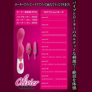 オリヴィエって言うんだけど、すごいんだよ。バイブとローターの刺激が同時に楽しめるんだって!しかも、フレキシブルなバイブで角度も自由自在!さらにさらに、大小異なるダブルローターにも注目だよ!たくさんのパターンの振動もあって、4つのポイントを刺激できちゃうんだから、本当に万能なアイテムだよ。