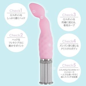 このおもちゃ、Gスポットをバッチリ刺激して、潮吹きしちゃう形状になっているんだって。先っぽの角度や、根本のクリスタルのデザインが入り口をやわらかく刺激してくれるから、すごく気持ちいいんだよ!