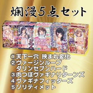 すっごくお得なセット!5個セットで14500円だよ。1番は、なんだろうね????2番のヴァージンループダブルモーションハードはきっと、モーションの強いバイブみたい!!3番は、ロリCQ2っていう子供っぽい名前だけど、どんなのかな?4番は、ヴァギナフィッターズ!女の子のお部屋にピッタリ!5番は、星おなトルネードっていう、トルネード見たいに回るオナホだよ。楽しそう!