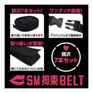 あの子を拘束できるボンデージ用ベルトがあるの。SMプレイの拘束が簡単にできるよ。バックル式のナイロンベルトで、装脱着も簡単。アジャスターでサイズ調整できるから、どこでもぴったりフィットするよ。7本セットで、手枷や足枷、頭枷、胴枷、太腿枷などいろんな拘束ができちゃうよ。家具に縛り付けたりおもちゃを固定したりもできるんだって。すごく簡単に拘束プレイが楽しめるよ。