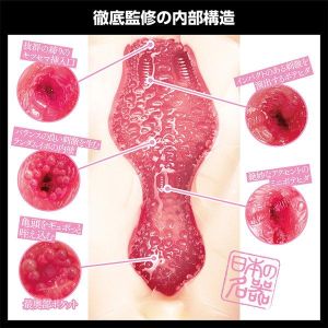 中は、バツグンのキツセマ挿入口から、ボテヒダ、ランダムイボの内壁、ミニボテヒダ、最奥部ポケットが亀頭をギュポっと咥え込んでくれるんだって!この中身を考えたのは20年オナホール開発の重鎮オナピュー氏だよ。彼がディレクションした「日本の名器」シリーズは、AVファンにも大好評なんだよ。