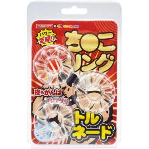 今度のトルネードち●こリングは特殊形状3個セット!一緒につけるとさらに効果アップ!伸縮性が高く、装着感がもっと良くなるの!やわらかエラストマー素材で簡単装着。男らしいスモークカラーで、締め付け感もバツグン!すごいパワーが湧いてくるよ!