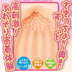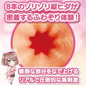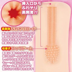 入口には、さきっちょを刺激するふわぞりロードがついてるんだよ。そして、八角形に細い縦ヒダがあるから、敏感なところを全方向から刺激することができちゃうよ。さらに、最奥には亀頭のカタチをしたコックドームがあって、しっかりとふぃっと感を感じられるんだよ!