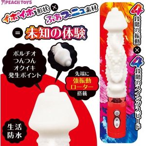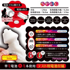 使いやすいバイブに、やわらかい素材のかわいい感じがする!先っぽには振動機能とパールが内蔵されていて、かわいさと本格的な機能を両立している!振動は5種類、回転は5段階調整できます。サイズは全長21.5cm、中に入れるところが10.5cm、太さは最大3.8cm。電池は単4を4つ使います。