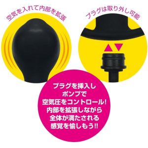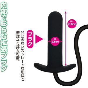 中が膨らむプラグだよ!ポンプで空気調節できて取り外して洗えるんだ。リッチタイプは中が圧迫されて気持ちいい形。拡張しながら満ちていく感覚を楽しもう!サイズは全長11.5cm/直径3.5cm。丸洗いもOKで滑らかに入るよ。でも、3回以上押したら体に悪いからやめてね。