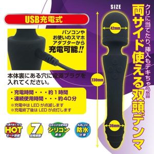 充電時間は1時間くらいで、バッテリーも40分はもつよ! ただし、状況や場所によってはちょっと短くなっちゃうかも! 大きさは全長230mm、ノーマルヘッド直径42mm、ホットヘッド直径36mmだよ。シリコン製で生活防水だから、お風呂でも使えちゃうし、USBで充電できるから便利!