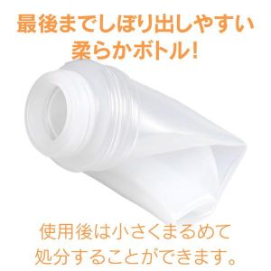 そして、容器もグレードアップ!ワンタッチキャップなので片手でもラクラク開閉できるの!それに柔らかいボトルで最後まで中身を絞り出せるから、ムダがなくてエコでいいよね!それに、捨てるときはコンパクトに丸めて捨てられるから収納場所をとらなくていいんだよ!
