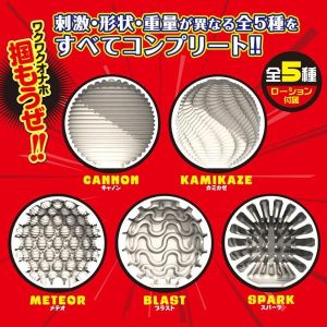 例えば、「キャノン」はスタンダードな形で、ヒダヒダがペニスを刺激してくれるんだ。それに対して、「メテオ」は無数のイボ突起が、流星のように襲い掛かってくるよ!「ブラスト」はウェーブ状に突起が配置されてて、カ○首を咥え込んでくれる感じ。他にも、「カミカゼ」と「スパーク」っていうのがあるんだけど、それらも全然違う刺激があって、どれを使うか迷っちゃうくらいなんだよね。