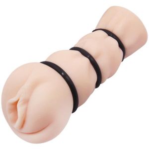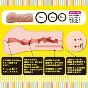 「貫通タイプ」っていうのは、ね、このグッズが中に空洞になってるってこと。女の子たちが大好きな、ふわふわでやさしい肉感があるんだよ!それに、リングっていうのが3個あるんだけど、それが入れたときに、ボディをギュッっと締め付けて上手に刺激してくれるんだ。えへへ、これでリアルな感覚をもらえるよ!