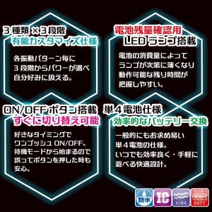 みんな聞いて!電池の残りがちょっと見ただけでわかるランプがついてるよ!バイブの振動は3種類で、パワーコントロールも3段階あるよ!使いやすさを大事にして、コントローラーやヘッドもすごいスペックだよ!水に強いのでお風呂でも遊べて、洗っても大丈夫だよ!アルカリ電池2本も付いてるからすぐに使えるよ!