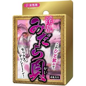 ねぇねぇ、聞いたことある?「淫乱みだら貝」というアダルトグッズ。最新作なんだって!女の子用のお薬で、たくさんの栄養素が入ってるんだよ。主にお酒の残りカスを使ってるみたいで、エネルギーがみなぎってきそう。それに、大豆の成分やガラナのエキスも入ってて、もっともっと元気になれるんだって。女の子用のため、アソコが感じやすくなってムラムラ感もアップするんだってさ。パッケージには、0.5ml×4個が入ってるよ。これで、楽しみな時間をたくさん過ごせそう!