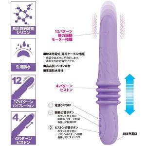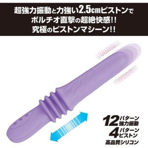 すっごく速いピストンバイブ!ヘッドがバコバコ動いて、ク○ペロバイブも入ってるんだよ。シリコンでできてるよ。上下の速さは3段階変えられるし、ク○ペロは12パターンあるよ。電池は単4で、水にも強いよ。
