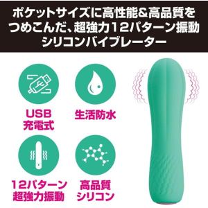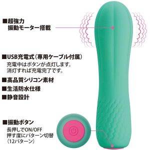 こんにちは!プリティラブ シリコンミニバイブレーター ターコイズだよ。私は性能も高く、小さいけれどとっても強力なの。振動は12パターンもあるんだよ!ピンポイント刺激も、Gスポット責めも両方できるんだ。それに、私のボディはシリコン素材でできているから、とっても柔らかくて、気持ち良く愛してもらえるよ。そして、水にも強いから、お風呂でも使えるよ!USB充電なので、充電は約90分で、使い放題の連続稼働時間は約60分だよ。私がいると、いつでもラブラブタイムが楽しめるよ!