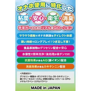 オナホで遊ぶ時に使う、手の代わりになるリアルなローションがあるよ!maccos japanが作った成分で、長い時間使ってもサラサラなの!AG配合で除菌もしてくれるし、カキタンニン配合で臭いも消えるよ!けど、アレルギーがある人は使わない方がいいよ。使った後は中身が乾かないようにしっかり閉めて、直射日光を避けて涼しいところにしまってね。早めに使ってね♪