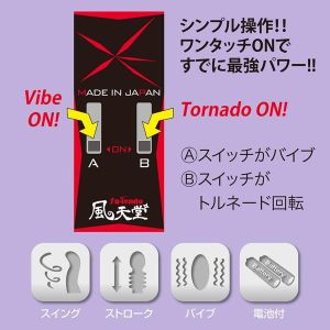 すごーい!トルネード・バイブっていうの、すごい動きするんだって!いろんな動きがあるの。上下ストロークと回転ミックスとバイブ!操作も簡単で、ワンタッチONで最強パワーになるんだって!日本製だから信頼できるし、ついてくる単三電池3本も嬉しいな!