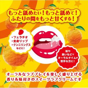 この「チュッパリップス オレンジ」はね、普通のラブクリームと違って、甘い香りに美味しい味が付いているの!だから、オーラルプレイがスイーツを味わうように楽しめるの!フェラチオ、全身リップ、クンニリングスなど、オーラルなラブプレイがばっちりサポートされちゃうんだよ!