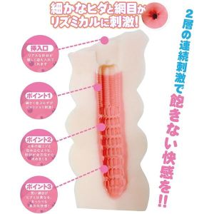 中に入ると、6つの縦ヒダと細かい横溝がジョリジョリ攻めてきて、次には粗い網目が待っています。でも、柔らかい素材だから、絡みつく感じで責めてきます。ゾクゾクすると強烈なフィニッシュがあなたを襲います!びっくりしちゃった?でも、耐えることができるかな?!