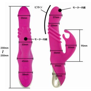 その名の通り、先端が伸縮するバイブなんだって。上下運動でGスポットを刺激してくれるんだよ。しかも、肌触りがすごくなめらかで、柔軟な当て心地があるんだって。美しい曲線を描くスラリとした先端部分と、大きな子機バイブが特徴的なんだって。それに、持ち手部分はメタリックで高級感があるんだって。すごくおしゃれだよね!